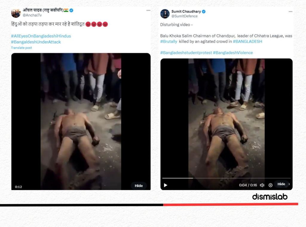 Several accounts on X (formerly Twitter) (1, 2, 3, 4) shared a video showing a man being brutally beaten by an agitated mob, falsely claiming that the victim was Hindu. Upon verification, it was revealed that the video actually shows Lakshmipur Union Parishad Chairman Salim Khan of Chandpur Sadar Upazila in Bangladesh.