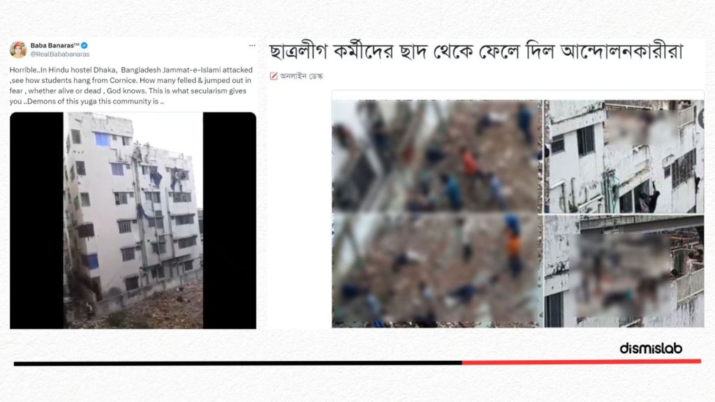On August 7, multiple accounts on X (formerly Twitter) (1, 2, 3) shared a video claiming that Jamaat-e-Islami had attacked a Hindu hostel in Dhaka, with students seen clinging to the cornice to save their lives.